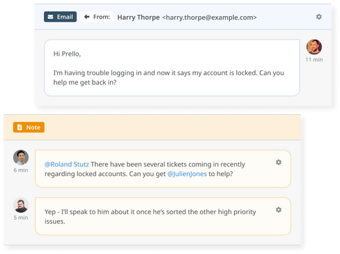 Agents can use @mentions to ask for help, discuss, and make support decisions all within a single ticket protected from customer view. Notes aren’t included in messages, meaning you don’t share private internal communications outside your help desk.