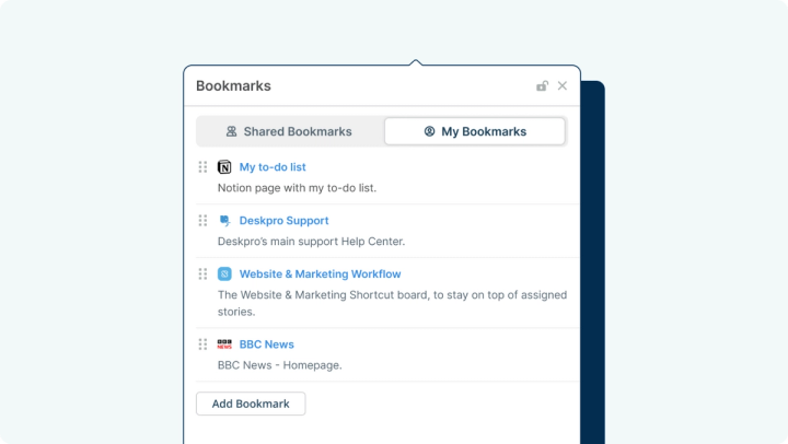 The Bookmarks app provides an effortless access point for agents' frequently used links. Plus, you can create global bookmarks for all agents across the help desk.