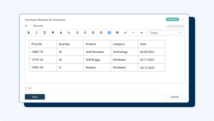 Create canned responses with formatted tables to make adding repetitive responses simple for your agents. Pre-made tables can be inserted into a reply with two clicks.
