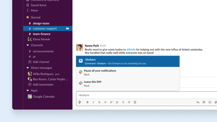 Deskpro's Slack integration offers teams seamless ticket creation and management directly from Slack with a simple /deskpro command.
