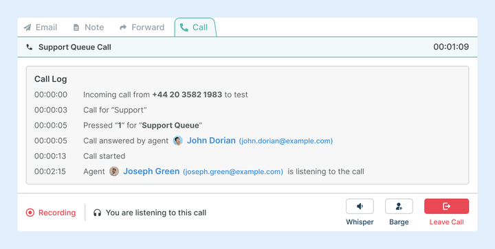 - Call Monitoring: Let supervising agents listen in on live calls to provide real-time support and coaching to agents with call listening, whispering, and barging.