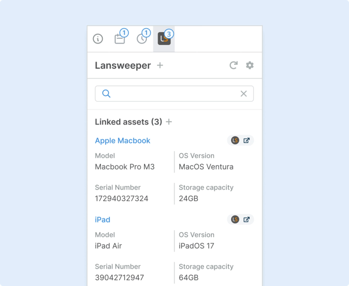 Streamline asset management with Deskpro's Lansweeper integration. Link devices to users and search against a list of your organization's devices for a comprehensive view of your IT environment from Deskpro.
