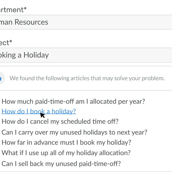 Reduce pressure on your internal support team by automatically suggesting relevant articles to employees when they go to submit a ticket.