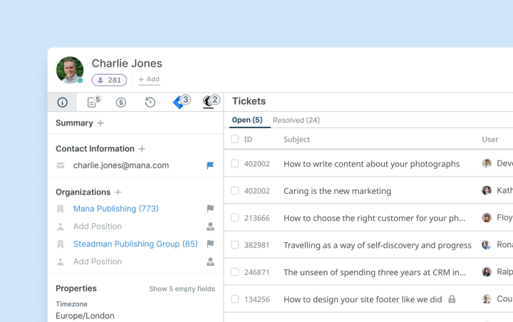 In March, we implemented a fresh design for our CRM profiles. We introduced a new table layout for Tickets on both User and Organization profiles, to give you a clearer overview of information.