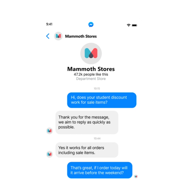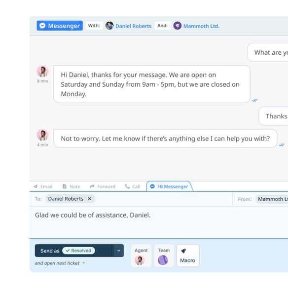 Provide excellent customer service by allowing customers to message your brands page on Facebook; easily automate replies and chat with customers from your help desk platform.